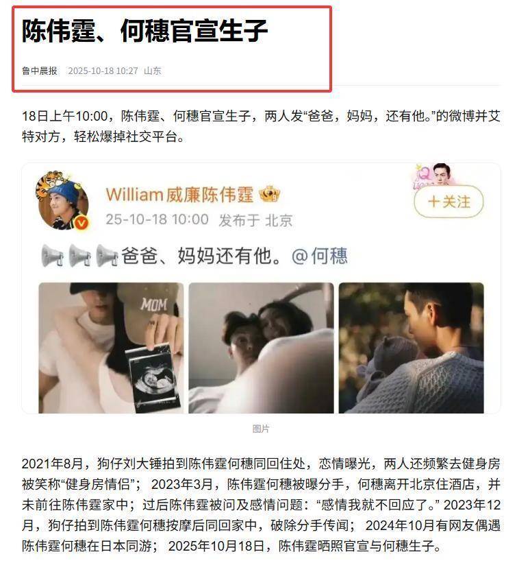 10日,陈伟霆和何穗同时官宣生子,这一消息瞬间在网上炸开了锅。